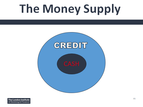 Modern money is fiat money (backed by nothing other than itself) and composed of a small inner core of cash/legal tender and an outer ring of credit created money. Together they make up the money supply as illustrated below and it may help at this point to focus on the TWO RINGS OF MONEY