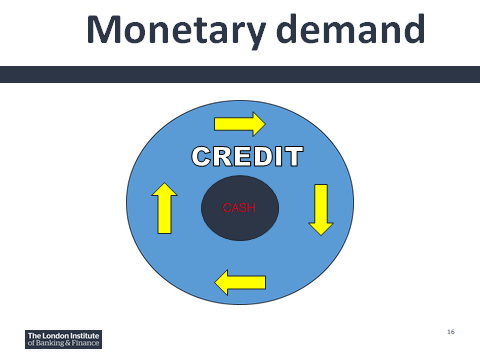 Before we look at the crises (GFC & GEC) take note of the fact that monetary policy is about managing the amount of monetary demand in the economy. To do this the Central Bank has two main levers of control. Firstly it can manipulate the cash component of money where a simple example is quantitative easing (QE). This will increase the inner ring of money or alternatively quantitative tightening (QT) will reduce the size of the inner ring. Secondly the Bank can manipulate the official interest rate (Bank Rate, Refi Rate, Fed Funds Rate) and encourage more demand for bank lending by lowering rates or less demand for bank lending by raising rates. This increases or decreases the outer credit created ring of money.