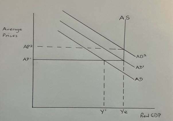 In the diagram Ye is represented by full employment and Y1 is the current equilibrium. The Keynesian solution was then to shift AD outwards through the government running a budget deficit until they achieve an equilibrium at full employment. (Ye). Should aggregate demand be higher than AD1 as illustrated by AD2 then over full employment would result in a rise in the average level of prices from AP1 to AP2 and a budget surplus would be required to dampen down the excess demand. If all the numbers were correct then all the government had to do was act as a thermostat and maintain the economy at full employment and not let it get too hot or too cold.